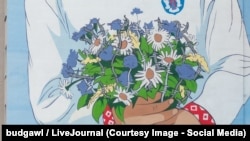 Минск на изображении олицетворяет мальчик в красной кепке, Москву – девочка с мыльными пузырями. Колючую проволоку неизвестные пририсовали к букету в руках у мальчика и к венку на голове у девочки.