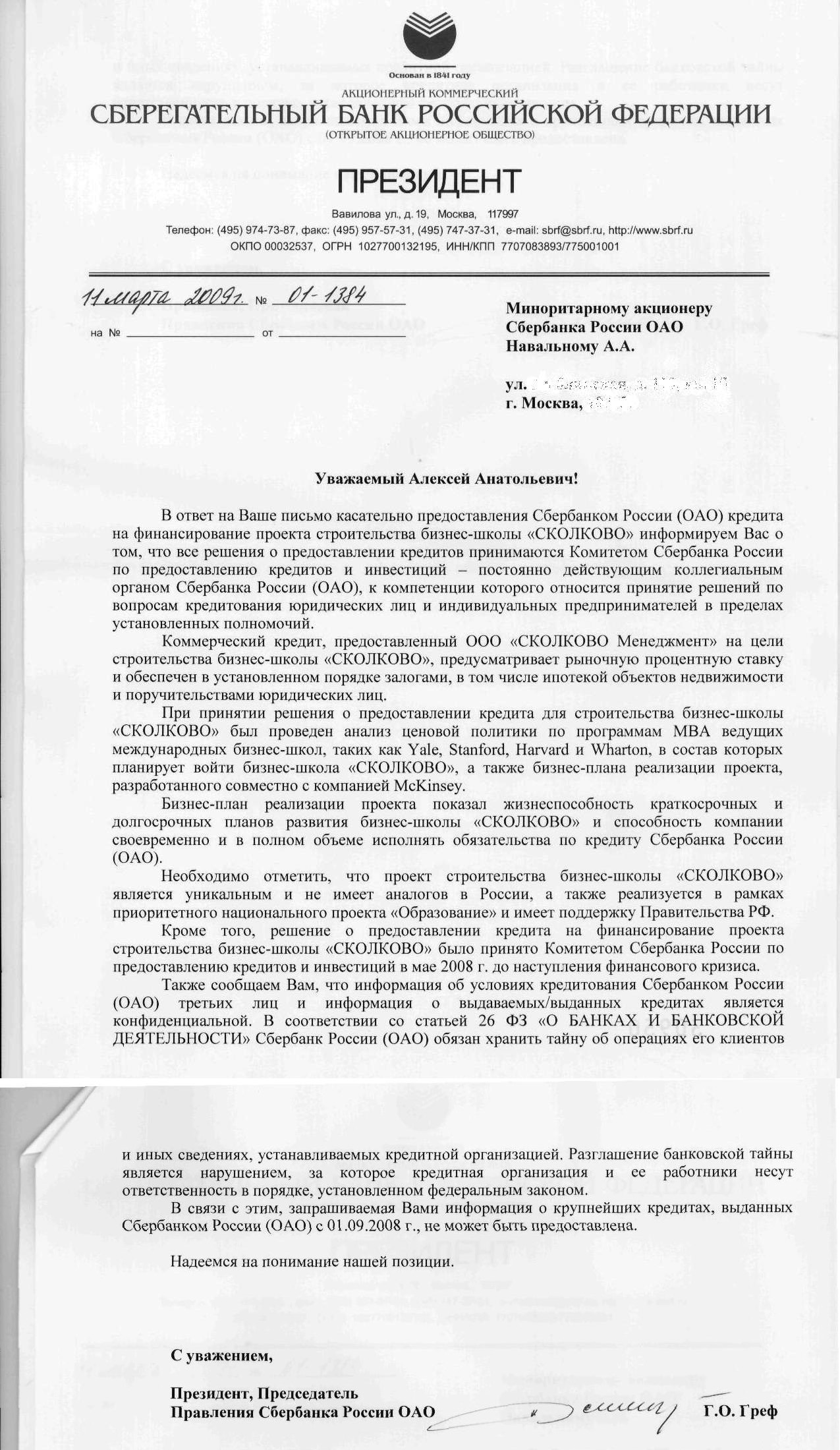 Миноритарный акционер Сбербанка Алексей Навальный получил письмо от главы банка, Германа Грефа. В письме - ответ на запрос акционера о кредите в почти четверть миллиарда долларов, который был выделен Московской школе управления "Сколково".