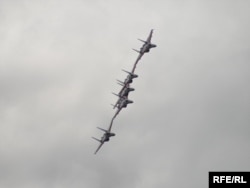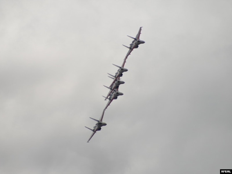 В совместном пилотаже в День воздушного флота России, который традиционно отмечается в третье воскресенье августа, принимали участие девять машин - пять истребителей Су-27 и Су-30 из группы "Русские витязи" и четыре истребителя МиГ-29 из группы "Стрижи".