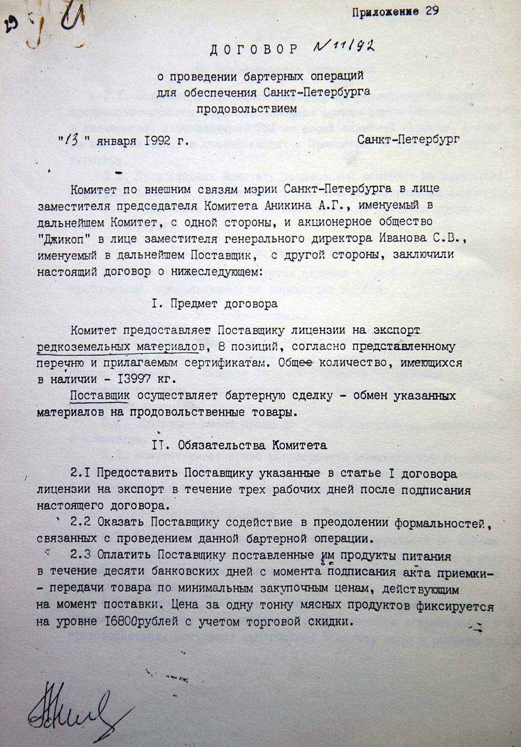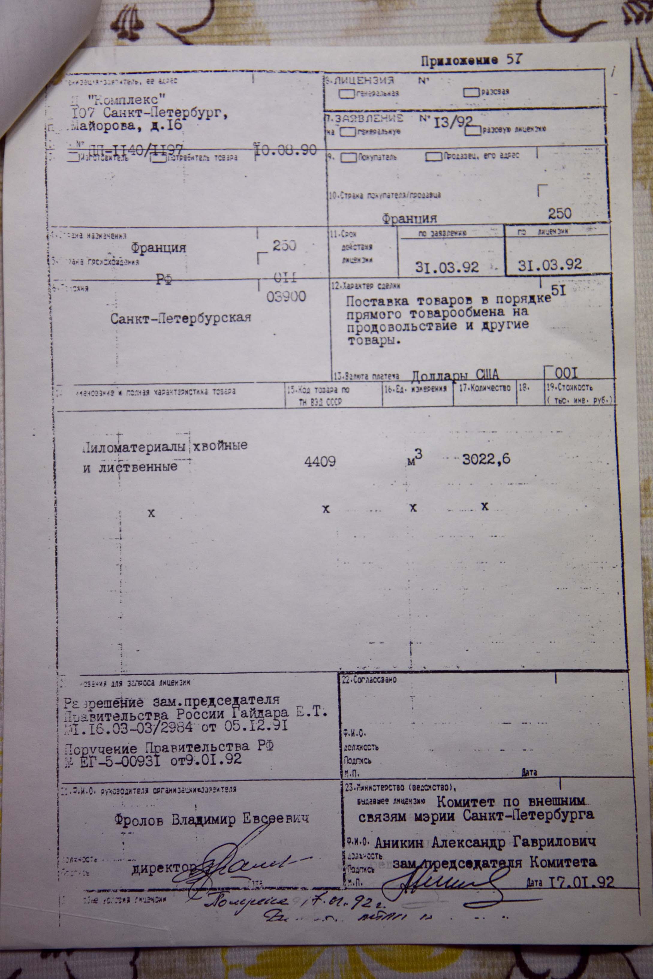 Тем не менее, лицензии подписаны почему-то именно Путиным, а также его заместителем Александром Аникиным. И они же заключали экспортно-импортные контракты от имени Комитета по внешним связям мэрии Питера. Ничто не мешало Путину