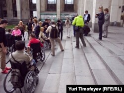 Вторая неудача постигла столицу метров через двести, у входа на станцию метро "Боровицкая". Никто из колясочников приблизиться к нему не пожелал и здоровым коллегам не рекомендовали: "Дверью убьет".