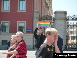 Активисты "Народного собора" советовали геям убираться вон. Хоругвеносцы плюнули в сторону геев. Полиция не реагировала.
