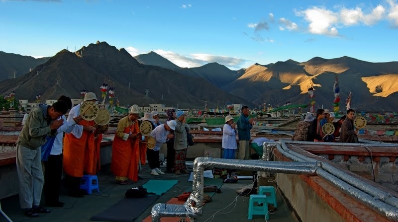 Итак, мы успешно пересекли границу в местечке, отличающемся от тибетской столицы всего лишь одной буквой – Кхаса. На протяжении всего трехдневного пути на автобусе до Лхасы мы не могли ступить шагу без нашего гида. Мы думали, что он – по совместительству сотрудник китайских спецслужб. Но то ли сыграла свою роль его принадлежность к тибетскому народу, то ли простая усталость и невнимательность – и он упустил тот ключевой момент, когда в Лхасе рано утром 31 мая мы надели-таки монашеские одежды и достали свои барабаны.