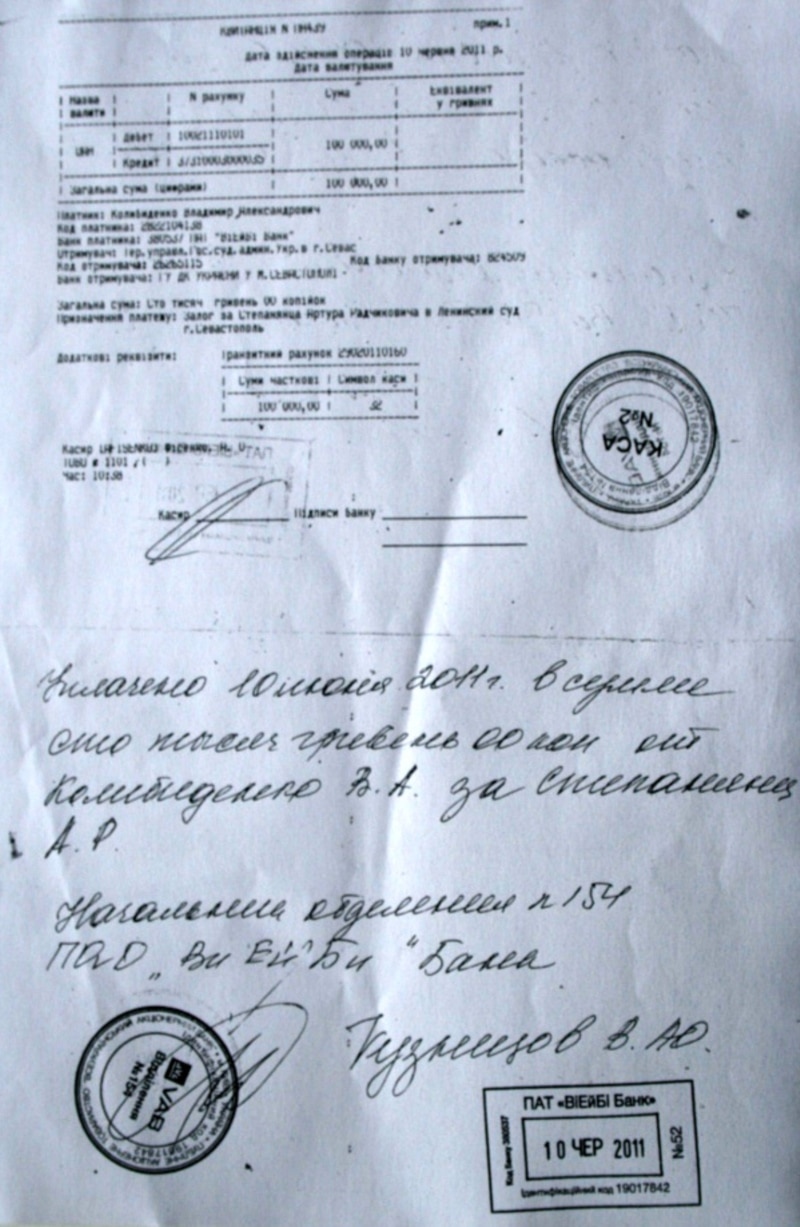 Но не вышло. Потому что к 10 утра 10 июня сто тысяч гривен в обеспечение залога внесены – были. В 154-е отделений "Ви-Ей-Би" Банка. О чём начальником отделения В.Ю.Кузнецовым и была выдана справка. Положенная защитниками на стол судьи. И вот тогда началось то самое спортивно-театральное действо, которое лично мне прекрасно было знакомо по моему собственному судье Петру Егоровичу Штундеру.