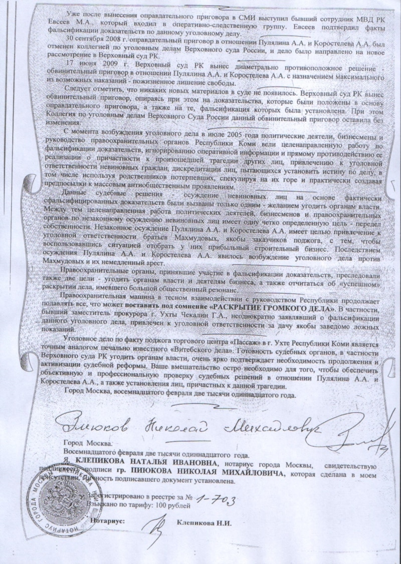 "...Целенаправленная работа политических деятелей, бизнесменов и правоохранительных органов по незаконному осуждению невиновных лиц имеет одну четко определенную цель- передел собственности. Незаконное осуждение Пулялина А.А. и Корастелева А.А. имеет целью привлечение к уголовной ответственности братьев Махмудовых, якобы заказчиков поджога, с тем, чтобы воспользовавшись ситуацией отобрать у них прибыльный строительный бизнес", – утверждает отставной генерал ФСБ.