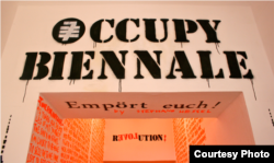 Но вернемся к участникам биеннале. В основном это различные группы Occupy: Захвати Берлин, Захвати Франкфурт, Захвати Амстердам, Захвати музеи, Захвати Уолл-стрит и другие под общим лозунгом «Захвати биеннале». Эти группы определяют себя, как „заговор слабых“ в пространстве Global Square.