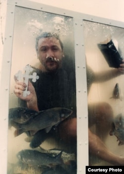 Олег Кулик: Рыба заплыла под сутану, во время перформанса не было видно, между ног что-то скользкое скользило. И вдруг, когда я нырнул в очередной раз, открыл книгу, стал пускать бульки, подплывает огромный карп, ободранный слегка, с такими зеркальными чешуйками: мол, не увлекайся. Я протянул руки и его взял.