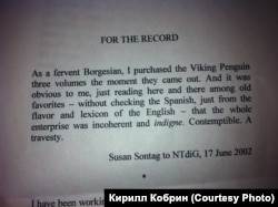 Дело в том, что та самая юная и очаровательная Мария Кодама, ставшая в 1986 году, за несколько недель до смерти старца, его женой и наследницей, отказала Ди Джованни в праве печатать его переводы Борхеса, навсегда сделавшие, если верить Норману, робкого аргентинца американской литературной знаменитостью. "Навсегда" – преувеличение, конечно; я так и вижу, как улыбнулся бы, услышав это слово, автор "Истории вечности". Сойдемся на том, что переводы Ди Джованни, напечатанные на рубеже шестидесятых и семидесятых в "Нью-Йоркере", превратили Борхеса из странного аргентинского мистификатора и любителя букинистического хлама в самого актуального писателя начинавшейся эпохи постмодернизма. Сам Ди Джованни утверждал, что был соавтором английских версий поздних борхесовских рассказов; по крайней мере, гонорары они с автором делили поровну. Думаю, Кодаме – уже в конце восьмидесятых – не понравилось именно это обстоятельство; качество переводов вряд ли ее особенно занимало. Так или иначе, новые, посмертные, пост-диджованные переложения "Алефа", "Сада расходящихся тропок" и прочих признанных шедевров вызвали у некоторых настоящее разочарование, если не сказать негодование. Сьюзан Зонтаг в письме Ди Джованни назвала вышедший в 2002 году в Viking Pinguin трехтомник "косноязычным и возмутительным", а Пол Теру отрезал: "Это не Борхес". Справедливости ради заметим, что в прессе рецензии на новый перевод классических текстов носили благожелательный – а кое-где даже и восторженный – характер.