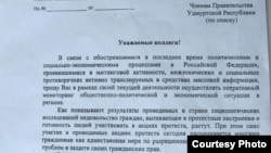 В этом письме главным фактором, способным дестабилизировать обстановку в регионе, названа протестная активность населения. Приводятся примеры, что следует понимать под этим термином – «итальянская забастовка» ижевских педиатров, голодовка педагогов Сигаевской школы искусств, реакция граждан на тяжелое по последствиям ДТП на одной из центральных улиц Ижевска, расследование которого граждане просто взяли под свой контроль.