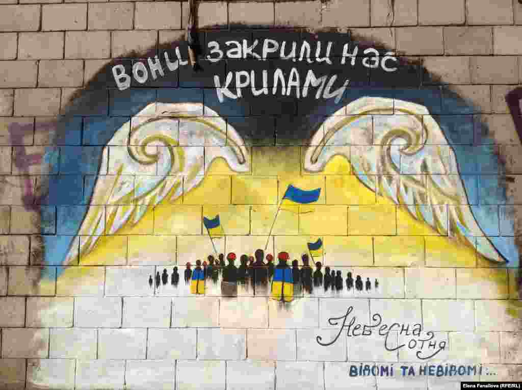 Народные памятники погибшим в Киеве на улице Институтской, где 21-22 февраля прошли жестокие столкновения между Евромайданом и Беркутом, демонстрантов расстреливали из снайперского оружия. Этот фрагмент Майдана останется при грядущей реконструкции