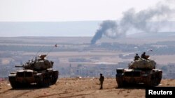 Курдские защитники города подвергаются интенсивной бомбардировке в том время как турецкие танки стоят за пределами сирийской территории возле границы и ничего не предпринимают, чтобы помочь защитникам Кобани.