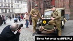 А эта фотосессия показалась мне чрезвычайно занимательной. Фотограф долго снимал этих людей, а потом вдруг попросил убрать американский флажок, который всю дорогу висел над этим союзническим ретро-авто. Один из позирующих снял флажок, аккуратно сложил его в салоне автомобиля, и фотосессия продолжилась без него. Чем фотографу помешал этот флажок, я так и не поняла. А спросить было, конечно, неудобно.