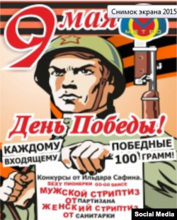 – Вы упомянули о таксистах. Есть такая акция – "Подвези ветерана". Насколько я понимаю, ветераны могут бесплатно себе вызвать машину 9 мая в определенное время, и к ним будут приезжать. Но само название акции – "Подвези ветерана" – представляется так: что люди хватают каких-то ветеранов и везут их куда-то. Или, например, плакат КПРФ к Первому мая – "Единственная сила, которая может противостоять фашистам, Западу и либералам, – это советский народ". Это абсурд, потому что советского народа никакого нет. Или реклама клуба – "Каждому входящему – победные 100 грамм". У стриптиз-клуба слоган вечеринки – "Капитуляция". Так надо понимать, что 9 мая стриптизерши капитулируют перед кем-то. И все это на фоне ленточек и звезд. Реальность получается такой вывороченной, что плакаты, соответствующие этим реальностям, в лозунге оказываются полностью абсурдными.