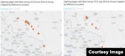 На фотографиях, размещенных в открытом доступе в интернете военнослужащими 147-го и 2-го автомобильного батальонов, содержится масса информации о передвижении российских военных колонн к украинской границе. Мы выяснили, что чаще всего военный транспорт движется из Курска и Воронежа по трассе М4 в Миллерово, российский Донецк и далее в Ростов-на-Дону. В рамках уже упомянутого в этом расследовании проекта по отслеживанию маршрутов передвижения российской техники мы изучили сотни фотографий и видеозаписей военных колонн, сделанных как в России, так и на территории Украины. На карте ниже – географические метки, сделанные на основе нашего исследования материалов, связанных с транспортировкой "Буков" в июне и июле 2014 года: