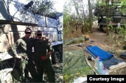 Слева: военнослужащий 53-й зенитно-ракетной бригады позирует, облокотившись на закамуфлированный ветками "Бук". Первые две цифры на шлеме обозначают номера батальона и батареи. Фото сделано в августе 2014 года. Справа: солдат этой же бригады сидит на "Буке". Географическая метка – Волошино, деревня недалеко от Миллерово. Дата загрузки фото – август 2014 года: