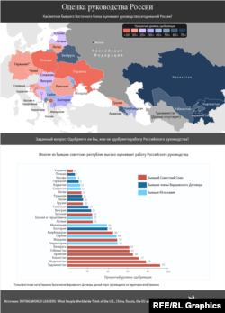 В то же время сама Россия стала единственной из пяти рассматривавшихся держав, чей отрицательный рейтинг оказался в среднем выше положительного: соответственно 36 и 22 процента. Ниже - более подробно о том, как оценивали действия российского руководства в соседних с Россией странах бывшего СССР и Восточной Европы