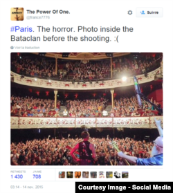 Фото, подписанное "Кошмар. Фото из зала перед стрельбой" на самом деле снято в концертном зале "Олимпия" в Дублине, на концерте 10 ноября прошлого года.