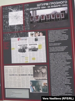 На стенде, посвященном штурму Грозного с 30 декабря 1994 по 4 января1995 года, в центре – большой газетный разворот "Новогодняя карусель". Это разбор событий от имени очевидца. Вообще, свидетельства очевидцев занимают главенствующее место на выставке. Командир танковой роты говорит очень подробно, некоторые фрагменты его рассказа выделены желтым, например: "Когда они собрали нас на совещание перед штурмом, я понял, что они сами не очень верят в то, что говорят".