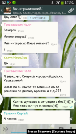 "Я знаю, что Смирнов хорошо общался с Кашкариной, – спрашивает в том же чате Нелли Тростянская. – Имел ли он какое-то влияние на ее решения по делам, арестам и т.д.???"