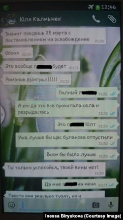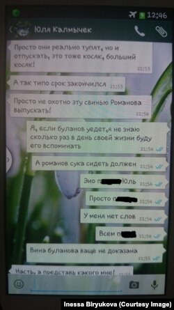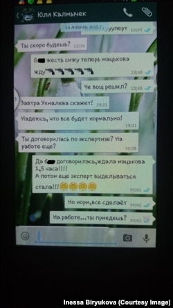 "Ты договорилась по экспертизе?" – спрашивает 14 января 2015 года Баряеву ее коллега, следователь Юлия Калмычек.