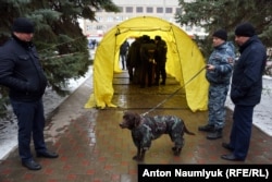 Полицейские с собаками осматривали камеры и штативы