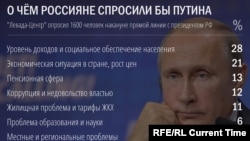 Как сообщил накануне пресс-секретарь президента Дмитрий Песков, среди популярных тем – рост цен, льготы и индексация пенсий, качество образования, борьба с коррупцией, бюрократизмом и кумовством среди чиновников, поддержка малого бизнеса, урегулирование конфликта на востоке Украины, отношения России с США, НАТО и с Западом в целом.
