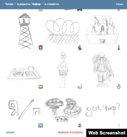 Сами по себе стикеры в мессенджерах – это некое дополнение к тексту, к фотографиям или видео, которое можно отсылать. Это расширение так называемых "эмодзи" – иконок, обозначающих разные состояния человека, разные предметы. Такой универсальный язык общения в мессенджерах. Я отправил Олегу полный лист этой "эмодзи-клавиатуры", которая существует сегодня в смартфонах, чтобы он как-то мог на нее ориентироваться, потому что к ним привязываются рисунки, которые потом превращаются в стикеры, и предложил: если идея понравилась, можешь нарисовать вообще все, что в голову тебе придет. Я не ограничивал его ни по тематике, ни по исполнению, полностью полагался на его выбор. Логично, что Олег в конечном итоге описал арестантский быт, который его окружает. В итоге получились скетчи, карандашные зарисовки, которые я просто перевел в цифровой вид, немножко обработал Photoshop и залил в Telegram. И в итоге мы имеем набор зарисовок, которыми вы можете делиться в мессенджере Telegram.