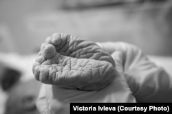 – Я снимала в Донецкой и Луганской областях на контролируемых Украиной территориях. Во-первых, я никогда не называю эти территории так, как вы их называете, я называю их "неконтролируемые территории", потому что для меня этих "государств" не существует, для меня это неконтролируемые территории Украины. Я была на контролируемой Украиной части Донецкой и Луганской областей, в нескольких городах, в Краматорске, который теперь столица Донецкой области, в Северодонецке, который столица Луганской, сняла украинских женщин там, это было безо всяких проблем. Проблему представлял Крым, конечно, потому что этот проект без Крыма существовать не имел права, это была бы, наверное, издевка над Украиной – сделать проект "Рождение Украины" без Крыма. Ехать в Крым я не хотела ни при каких обстоятельствах. Мы очень долго думали, что делать, то ли выставить кусок белой фотографической бумаги, то ли раскрасить эту бумагу в цвета украинского флага, но это все эстетически совершенно из проекта выбивалось. Потом мой товарищ, Валера Милосердов, который работает в "Изоляции", сказал: "Вика, нужно просто снять переселенцев, и это будет самый хороший ход". И я нашла в Киеве двух волшебных женщин-переселенок, одна из них родила накануне, и это съемка немножко другая, я пришла к ней, когда ребенку было почти сутки, а вторая была на сносях, беременная, я к ней приходила домой. Но в результате три фотографии на выставке – крымские, на одной написано "Бахчисарай, Крым \ Киев", на других – "Алушта, Крым \Киев", я думаю, это и есть настоящая связь Крыма с Украиной.