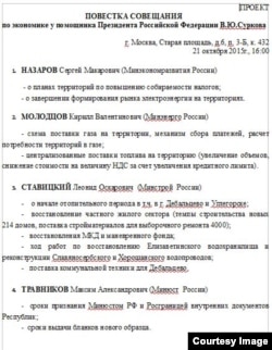 Среди опубликованных документов есть проект повестки совещания с участием заместителей министров экономического развития, энергетики, строительства и юстиции РФ. Оно должно было состояться в Администрации президента России 21 октября 2015 года. На совещании планировалось обсуждать распределение между министерствами задач, связанных с повышением собираемости налогов в "ДНР" и "ЛНР", предоставлением населению коммунальных услуг, восстановлением транспортной инфраструктуры на занятых сепаратистами территориях, признанием российскими ведомствами внутренних паспортов "народных республик".