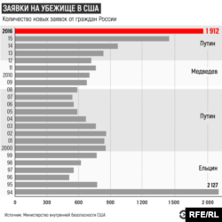 В 2016 году иммиграционные органы США получили от россиян 1912 прошений о политическом убежище, что на 30 процентов больше, чем в 2015 году и на 164 процента больше, чем в 2012 году, когда Владимир Путин был избран на третий президентский срок. Таковы данные, которые англоязычной редакции корпорации Радио Свободная Европа\Радио Свобода предоставили в Министерстве внутренней безопасности США. Американские специалисты по иммиграции связывают увеличение числа желающих покинуть Россию с усилением давления на представителей сексуальных меньшинств и инакомыслящих, а также с высоким уровнем коррупции в стране.