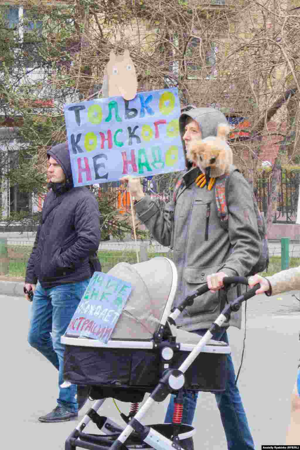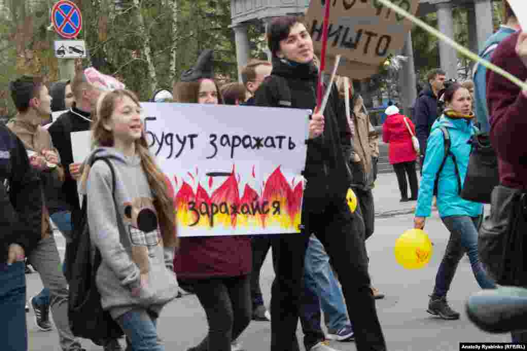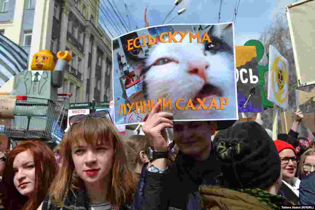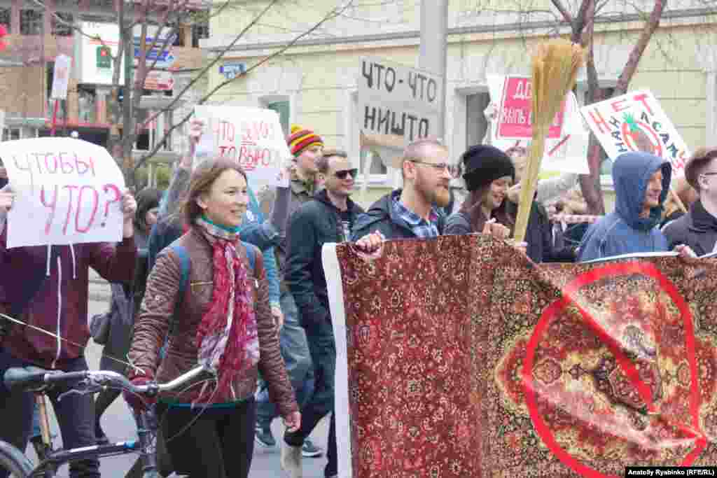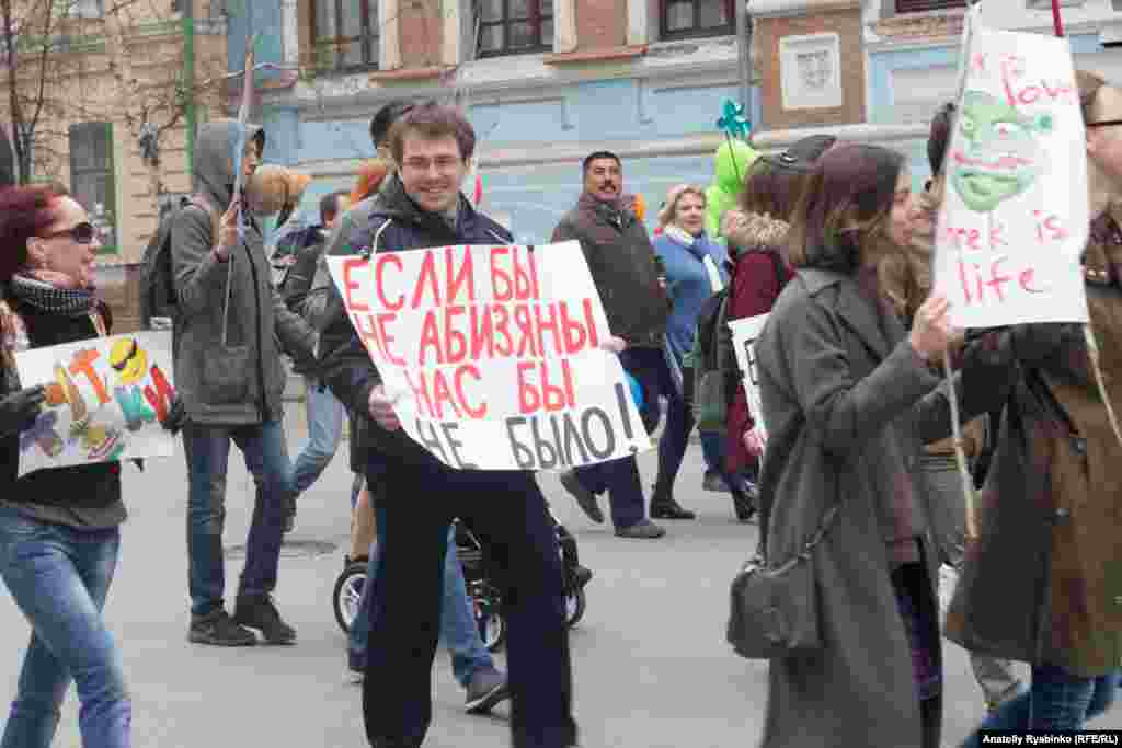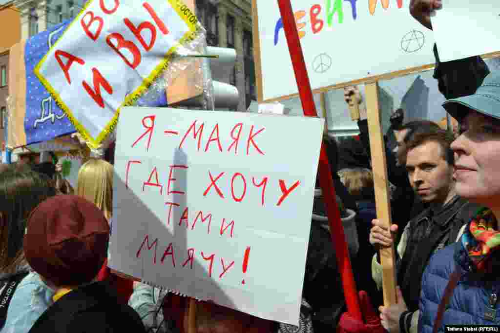В мероприятии, которое проходило как культурная акция, приняли участие около трех тысяч человек. Впереди шествия был развернут главный плакат "Запрещена в России". Были и другие лозунги: "Этому миру нужна клизма", "Прекратите оскорблять чувства ворующих", "Он вам не лимон".