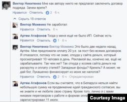 Нам удалось насчитать в стопке 720 белорусских рублей ($370), Агафонов уточнил, что на самом деле денег "немного больше". В комментариях в фейсбуке Агафонова под постом, где он рассказывает о намерении зарегистрироваться в качестве индивидуального предпринимателя, белорусский журналист Виктор Никитенко жалуется, что ему "предлагали оплату за пост в размере 20 долларов без всяких договоров", и именно поэтому он отказался сотрудничать с "Политрингом" и "Гражданским согласием".