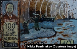 Нет худа без добра: абсурдная история со штрафом за татуировку привлекла внимание к одному из лучших молодых художников России. Никита Поздняков называет себя примитивистом, но среди его работ можно найти и обращения к поп-арту, соц-арту, абстракционизму. Понятно, что публика, следящая за творчеством Никиты Позднякова в соцсетях, сразу реагирует на эпатажные работы: граффити с Иисусом, портрет Ленина с обнаженными гениталиями, изображения Сталина и Гитлера в роли ведущих передачи "Спокойной ночи, малыши".