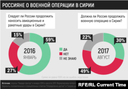 – Нет, о потерях люди очень мало знают, поскольку о них практически ничего не сообщается по федеральному телевидению, а это главные каналы информирования. Люди не понимают самого смысла, зачем нужно было лезть туда. Это далеко от России, и те версии, которые предлагают Кремль и официальная пропаганда, выглядят для массового зрителя не слишком убедительными. Борьба с терроризмом – это не очень понятно, потому что где Сирия и где Россия? Отстаивание каких-то интересов российских компаний – это по частоте второй вариант ответа, который давали россияне для объяснения этого, – это слишком абстрактно и не касается их повседневных жизненных проблем. Из общего контекста выстраивается линия конфронтации с США. И это людей действительно беспокоит очень серьезно, поскольку они понимают, что Россия вошла в клинч, в очень глубокую и длительную конфронтацию с Западом, которая может окончиться и Третьей мировой войной. Сейчас немножко страх перед этим ослаб, но он никуда не ушел, просто интенсивность этого снизилась, но страх сидит глубоко, люди этого боятся. Поэтому Сирия здесь в ряду тех конфликтов, в которые оказалась втянута Россия по воле ее руководства.