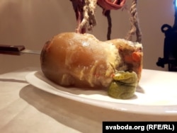 Арт-объект приготовили для выставки белорусские художники Анастасия Гончарова и Павел Юрков, назвавшие его "12 ножей в спину революции". Гончарова рассказала Белорусской службе Радио Свобода, что к 100-летию октябрьского переворота к образу Ленина обращаются многие художники, поскольку он является "мемом" революции. А холодец – это женский способ высказаться на эту тему, ведь "с пищевыми продуктами в течение своей жизни часто работает практически любая женщина" и "быт отнимает у них много времени". Выставка "Другое поколение есть другое пространство", как говорили ее устроители, посвящена революции, но другой – революции в вопросах "женской самоидентификации, роли женщины в обществе и в творчестве".