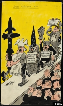Из бочки с надписью "Провокация, ложь, клевета" высовываются человекоподобные змеи: "Радио Свобода" и "Радио Свободная Европа". Человекоподобный человек с буквами "ЦРУ" на спине с помощью рук и ног, одних рук не хватает, жонглирует маленькими монстрами: "Голос Америки", "Радио Свободная Европа", "Радио Свобода".