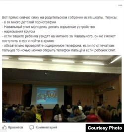 О необычном родительском собрании первым написал у себя в фейсбуке житель Ярославля, местный предприниматель, попросивший Радио Свобода не называть его имени из опасения за судьбу своих детей, которые учатся в школе №80. Позже он сделал пост доступным только для друзей, хотя к этому моменту его копия уже широко разошлась по интернету. На прикрепленной к посту фотографии видно, что на сцену проецируется слайд с заголовком "Наибольшую угрозу представляют". Под этой надписью – фотография Алексея Навального и эмблема движения "Артподготовка" Вячеслава Мальцева, бежавшего из России во Францию после от уголовного преследования по делу об экстремизме. Слова "Навальный" и "Артподготовка" на картинке закрыты непрозрачными плашками синего цвета.