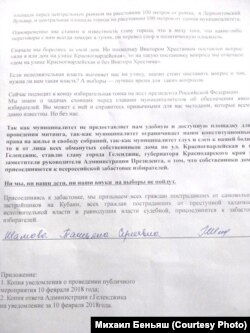 Как говорится в документе, подписанном представителем обманутых дольщиков Татьяной Шамовой, муниципалитет Геленджика "ограничивает конституционное право на жилье и свободу собраний", поэтому собственники квартир в проблемном доме, а также их дети и внуки "присоединяются к всероссийской забастовке избирателей" и не пойдут на выборы.