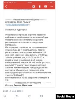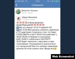 Стопроцентная явка и чаепитие с пирогами ожидается в Удмуртском государственном университете 18 марта. Автор сообщения рассказал Радио Свобода, что прийти студентов заставляют, но ни о каких санкциях за неявку пока не говорят.