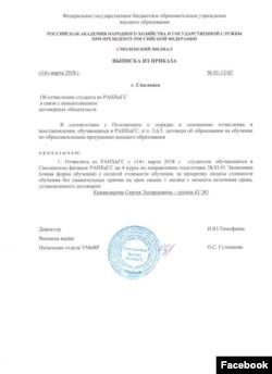 В пресс-службе Смоленского филиала РАНХиГС корреспонденту "7x7" сообщили, что приказ об отчислении подписали 14 марта 2018 года, причиной стала "просрочка оплаты стоимости обучения без уважительных причин на срок свыше 1 месяца с момента истечения срока, установленного договором".