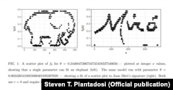 10. И под конец – самое странное. Молодой американский ученый Стивен Т. Пьянтадоси, которого журнал Forbes в 2012 году внес в список "30 до 30" – 30 подающих самые большие надежды ученых, которым еще нет 30 лет, – обнаружил удивительное следствие теории динамических систем. В своей короткой – всего 4 страницы – научной статье он демонстрирует, как построить элементарную функцию одного параметра, которая будет с любой заданной точностью соответствовать любому произвольному набору точек на плоскости. Иными словами, все рисунки из точек на плоскости будут являться отображениями одной и той же функции с разными значениями одного-единственного параметра.