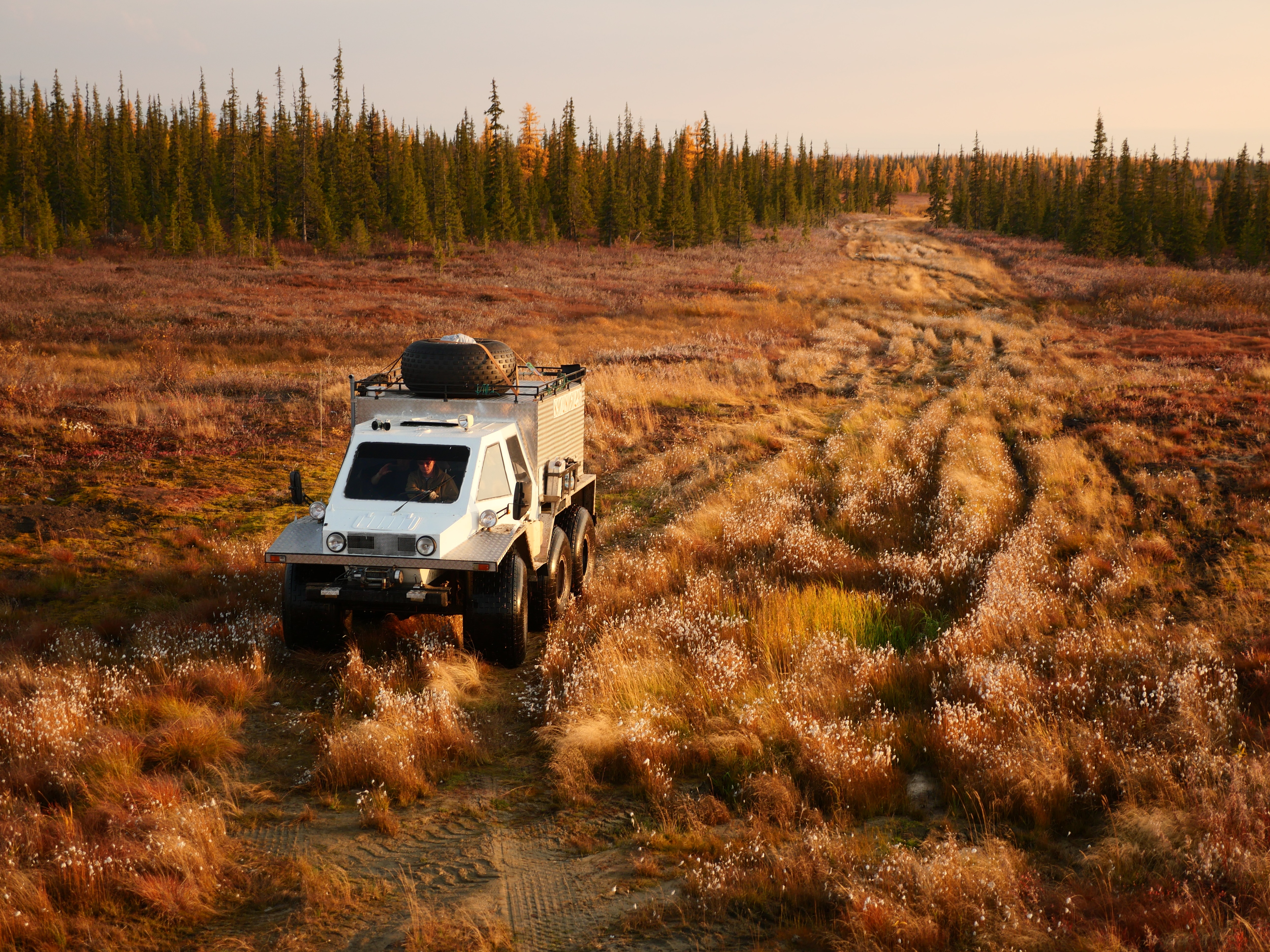 Только специализированные транспортные средства, как этот вездеход ТРЭКОЛ с бескамерными шинами со сверхнизким давлением, на котором мы ехали, способны преодолевать болотистую местность, где строилась железная дорога.