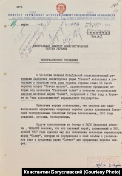 Будучи приглашенным на беседу в УКГБ Львовской области, ЧЕКАНОВ пояснил, что его знакомый еврей, проживающий в ПНР (Польской народной республике. – Прим. РС), весной 1967 года прислал ему для пополнения коллекции израильскую марку "Салют", которую он перерисовал в свой альбом в увеличенном виде и предложил фирме "Светоч" для оформления коробок конфет.
