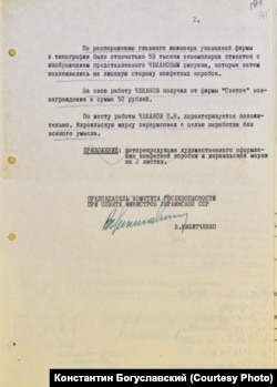 Принятыми мерами установлено, что рисунок для художественного оформления конфетных коробок сделан художником Львовской торгрекламы ЧЕКАНОВЫМ Петром Алексеевичем, 1921 года рождения, русским, беспартийным.