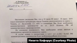 Сотрудник прокуратуры спрашивал о роли Кифорука в форуме "Свободные люди". Когда он отказался отвечать, сославшись на статью Конституции, следователь стал хамить. Затем активисту вручили уведомление о том, что 18 марта в отношении него будет возбуждено административное дело за осуществление деятельности нежелательной организации".