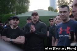 На первом плане слева, в бейсболке, стоит Григорий Палышев (аккаунт "ВКонтакте", сохраненная копия), в его аккаунте "ВКонтакте" фотография из зала для боевых единоборств, вымпел "Армейский рукопашный бой" и подписка на страницу "Федерация тайского бокса России". Обнаружить информацию о спортивных достижениях Палышева Радио Свобода не удалось.
