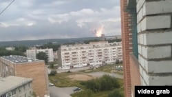 На видео, отправленном очевидцем в редакцию Радио Свобода, виден дым и зарево от взрывов, слышны разрывы.