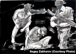 Сергей Захаров провел в заключении у сепаратистов полтора месяца. И на рисунках, которые легли в основу повествования, рассказывается о том, что он пережил. Бесконечные избиения, пытки, когда задыхаешься от недостатка воздуха в не приспособленном для содержания пленников тесном помещении, имитации расстрелов. Вот что он пишет об этом в своей книге: