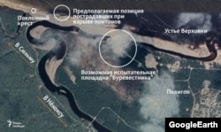 Примечательно, что на кадрах из похода, который прошел в июле 2019 года, понтонов нет, то есть они не являются постоянным элементом местного ландшафта. 8 августа американский Центр изучения проблем нераспространения им. Дж. Мартина Миддлберийского института международных исследований в Монтерее опубликовал спутниковый снимок компании Planet Labs, на котором виден район предполагаемой аварии. На снимке видно расположение участвовавших в испытаниях кораблей и понтонов. Если сравнить их местоположение с фотографиями понтонов, найденных Радио Свобода, можно сделать вывод, что после аварии их оттащили к берегу – причем военные не стали заводить зараженные радиацией плавучие платформы на территорию своей части, а бросили их на берегу рядом с популярной у местных жителей дорогой. Возможно, впрочем, что их попросту выбросило на берег после аварии, как об этом говорит на видео Владимир Босый.