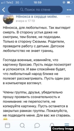 Автор этой записи в комментарии также просит не распространять фотографию за пределы группы. Пользователь, приславший снимки Радио Свобода, утверждает, что сам получил их уже в виде скриншотов. Впрочем, одна из жительниц села, состоящая в ныне закрытой группе "Нёнокса – в сердце моем", подтвердила, что эта запись там публиковалась. Она не согласилась переслать оригинальный снимок в более высоком разрешении.